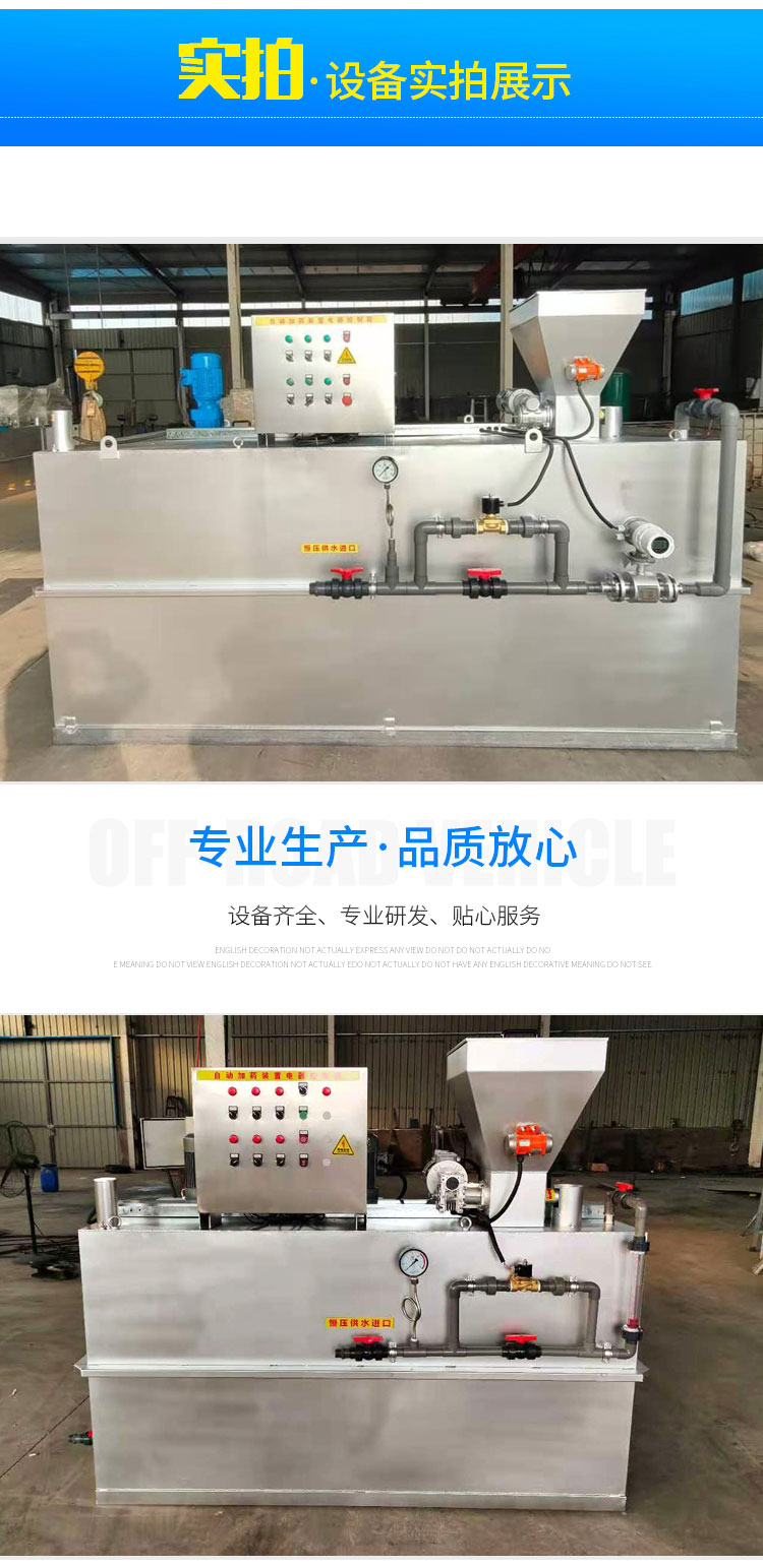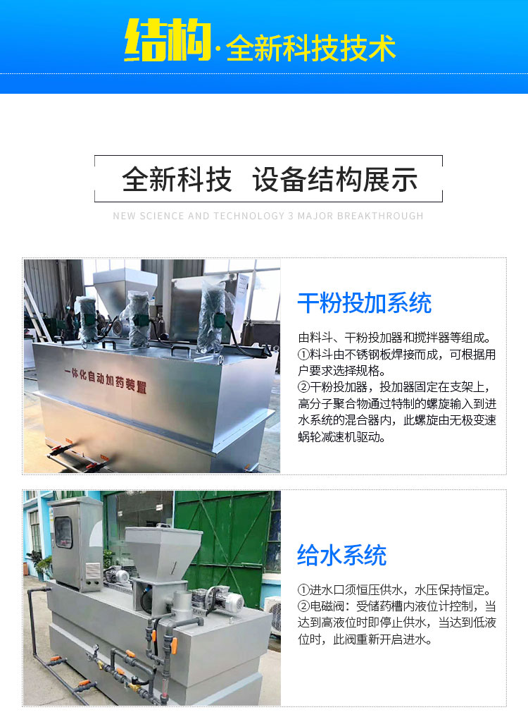 本裝置是粉狀藥劑的全自動連續(xù)配置及投加系統(tǒng)。干粉藥劑從料斗下部的螺旋推進器進入預(yù)混器與清水進行預(yù)混,被濕潤的物料進入配制槽進行稀釋混合,按用戶要求濃度進行配制;